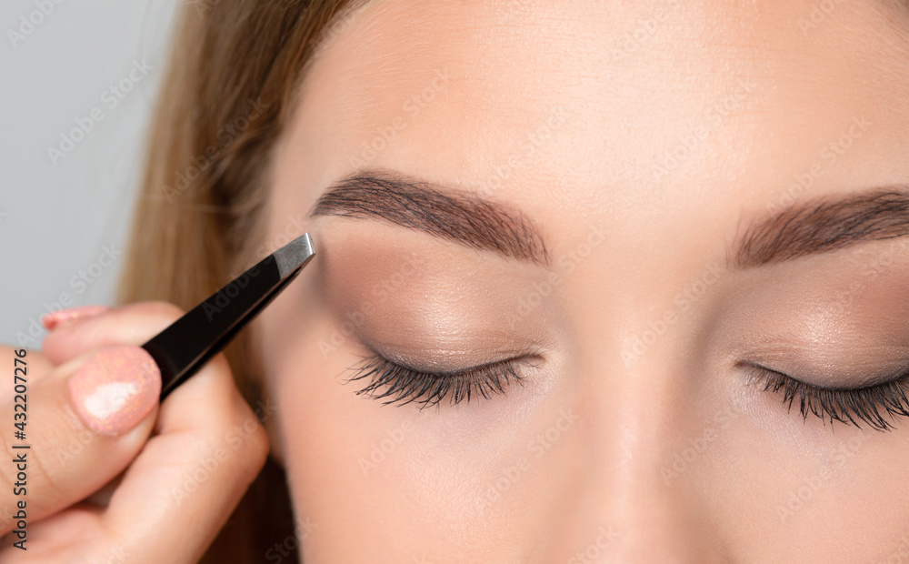 Makeup artist plucks eyebrows in a beauty salon. Professional makeup and cosmetology skin care.