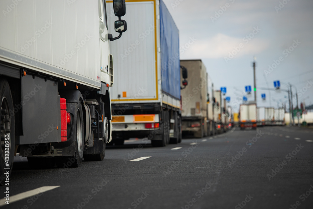 a long traffic jam of many trucks at the border , a long wait for customs checks between States due to the coronavirus epidemic, increased sanitary inspection of cargo transport