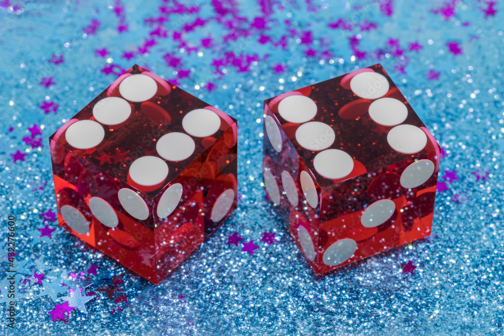 Two red transparent dice on a decorated holiday table. The result is "six" and "six". Macro photography. Jackpot and celebration.