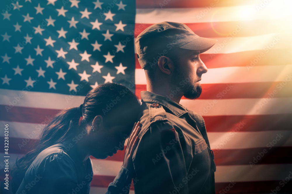 Memorial day, memorial day. The woman leans her head on the soldier's back, holding on to him with her hand. Couple on the background of the American flag. Side view.