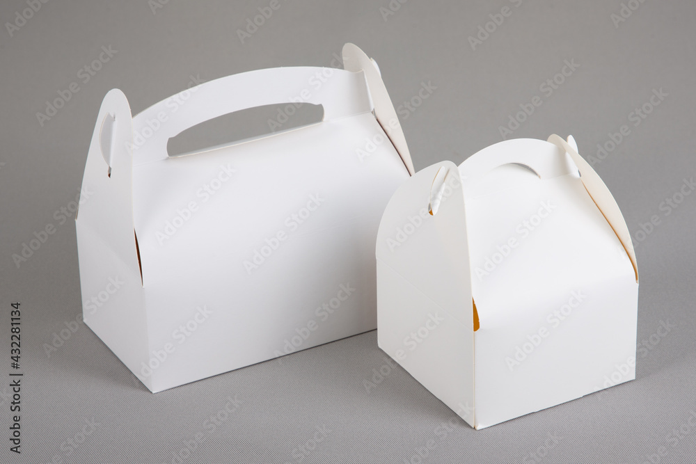 two white blank paper packaging for bakery large and small box with handle in grey background