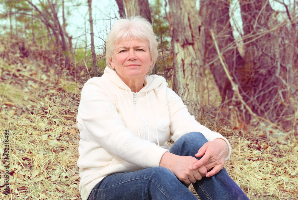 Pensive attractive mature woman sitting relaxing and gathering energy from the nature