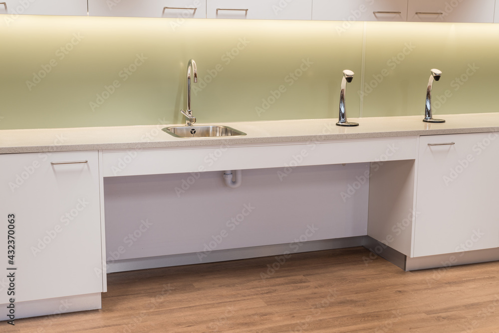 Modern kitchen sink with shallow depth sink and disabled access for wheelchair.