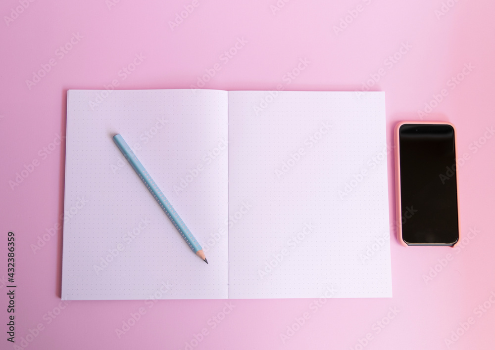 Blank Sketch book with pencil and smartphone isolated pink background
