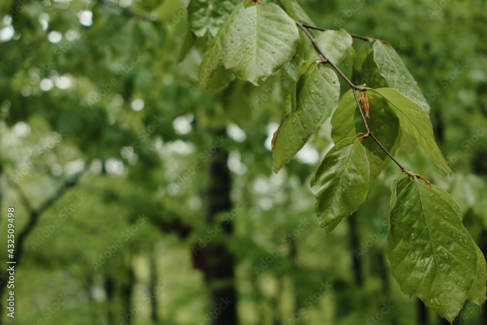 Regentropfen auf frischem Bchenlaub