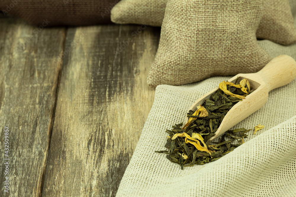 Dried green tea leaves in a wooden spoon