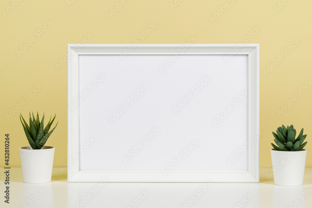 White blank wooden mock up frame and small succulent flowers on white desk with light yellow background. Front view