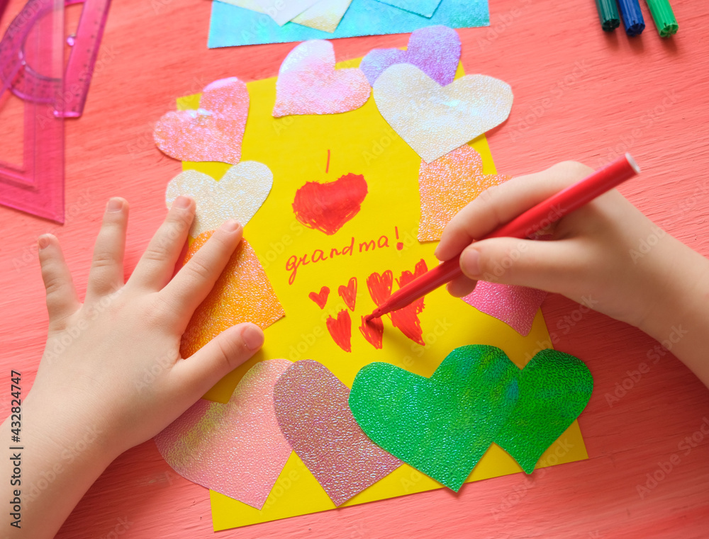 Little girl making card for grandma. Colorful pink background with paper decoration, multicolored hearts, Handmade concept for birthday, mothers day and grandparents day