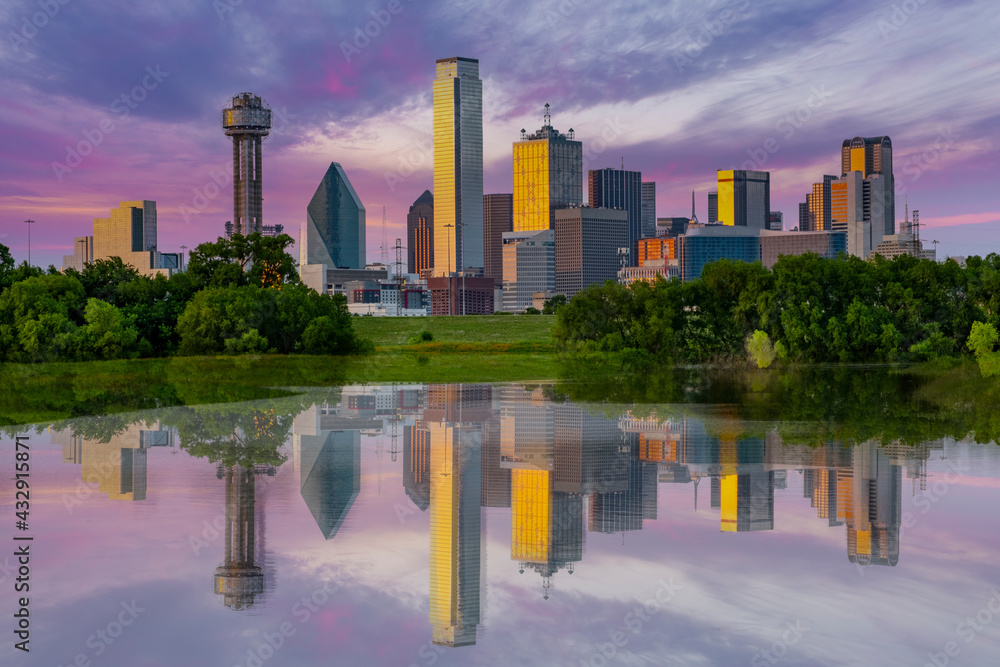 Dallas, Texas skyline with reflection on Trinity River