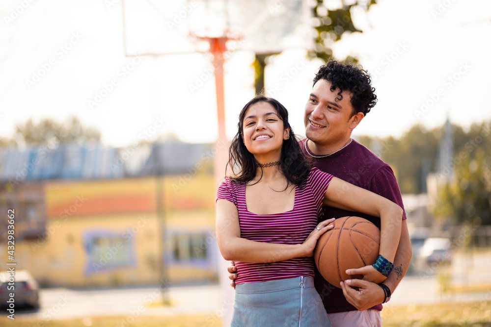 Young couple standing basketball court and holding ball.