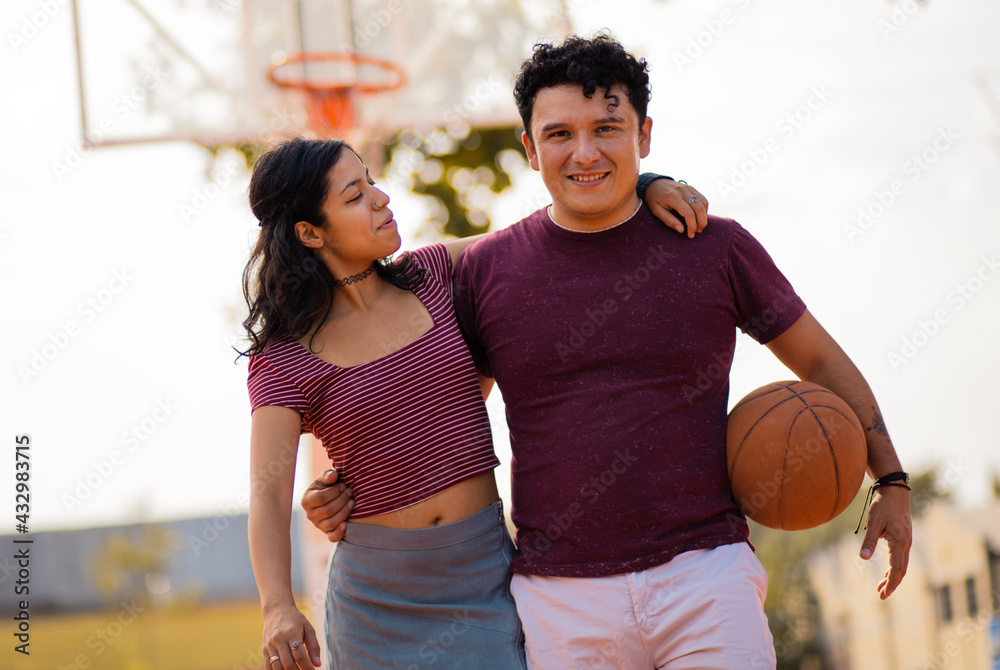 Couple with ball on basketball court. The match is over.