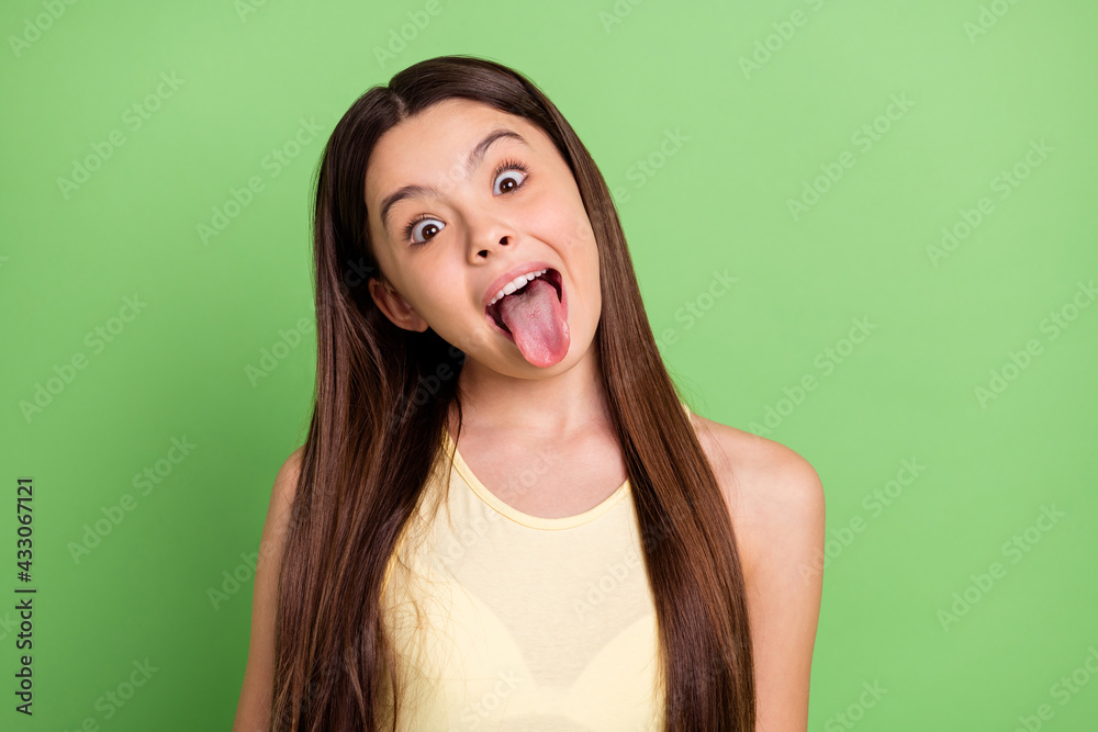 Portrait of young satisfied person open mouth tongue out look camera isolated on green color background