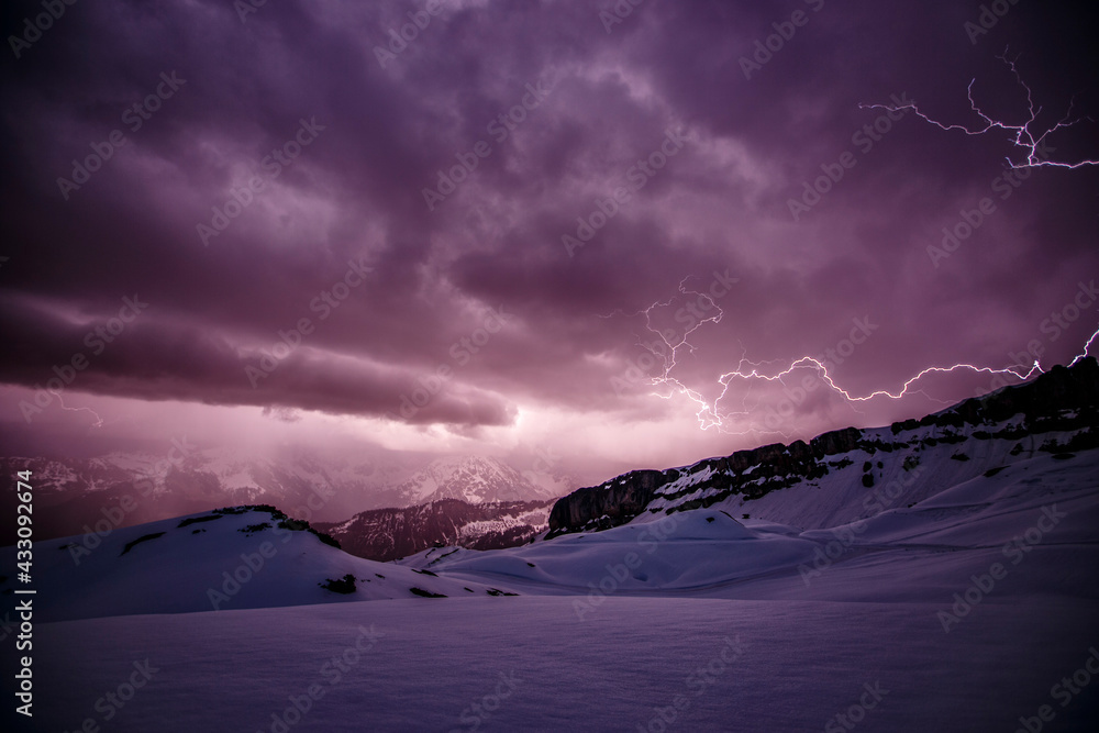 Gewitter Sturm mit Blitzen in Schnee bedeckten Bergen in den Alpen beim Wandern