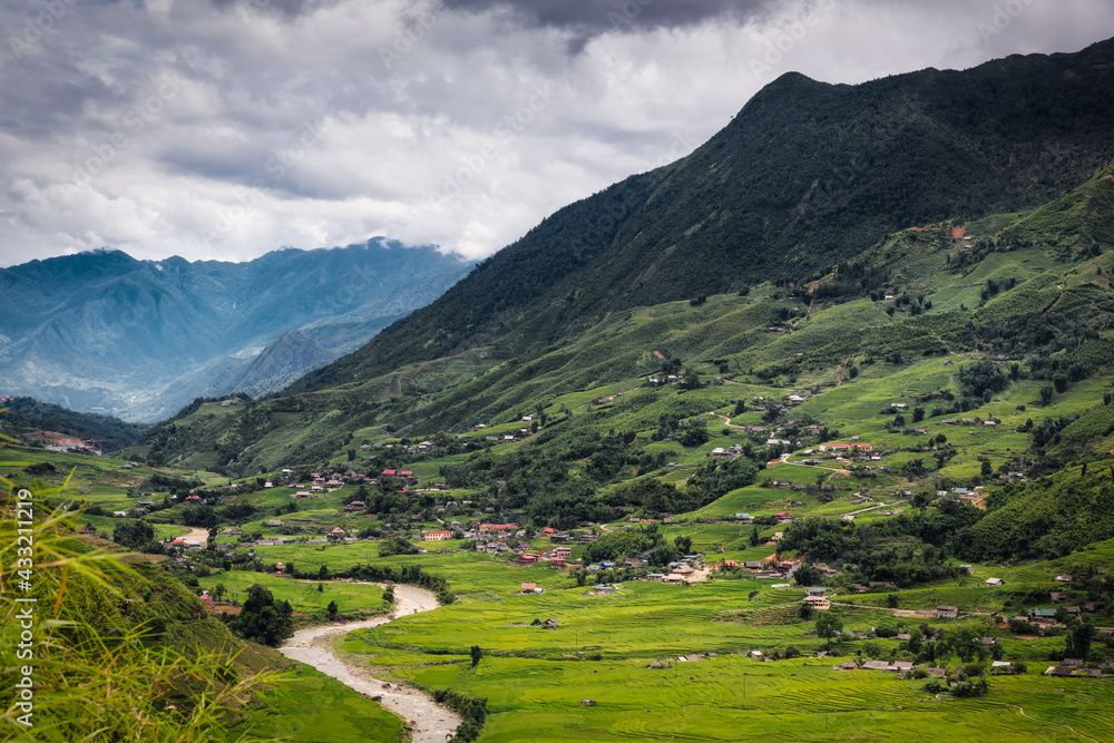 Panorama Scenery View of Agriculture Rice Fields, Nature Landscape of Rice Terrace Field at Sapa, Vietnam. Panorama Countryside Valley Scenic With Mountain of Agricultural Farmland Background.