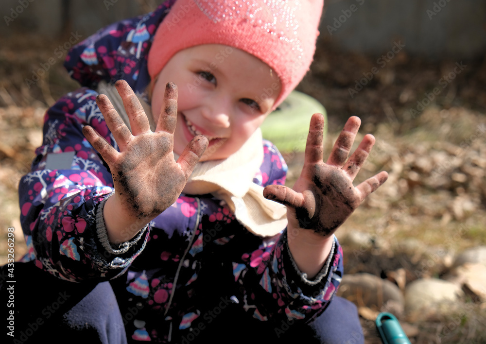 Small girl smiling and showing dirty hands outdoors in garden, sustainable lifestyle concept.