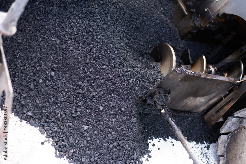 Details of industrial machinery working with asphalt, mixing bitumen with hot asphalt, layering on the road surface
