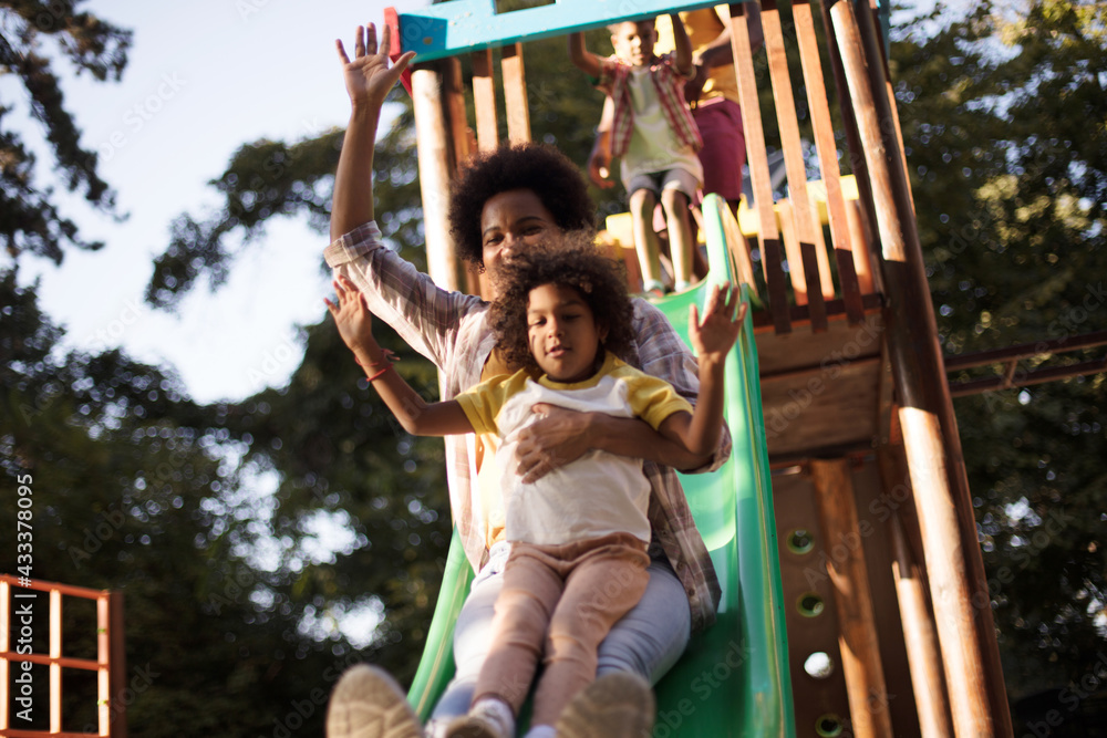 Playful family in the playground. African American mom playing with child on playground.