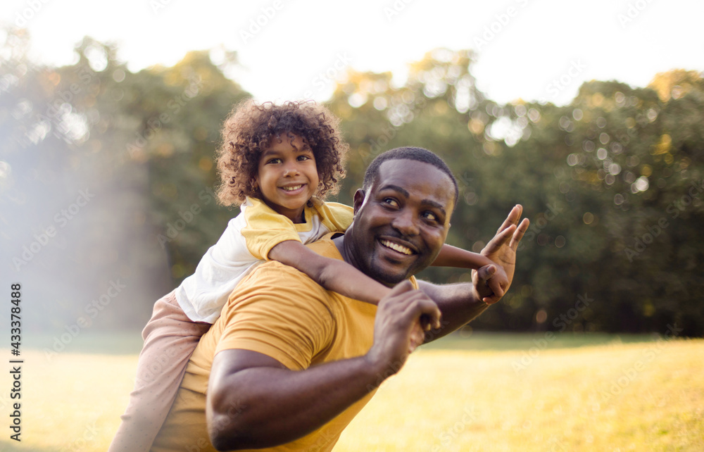 African American father and daughter having fun outdoors.