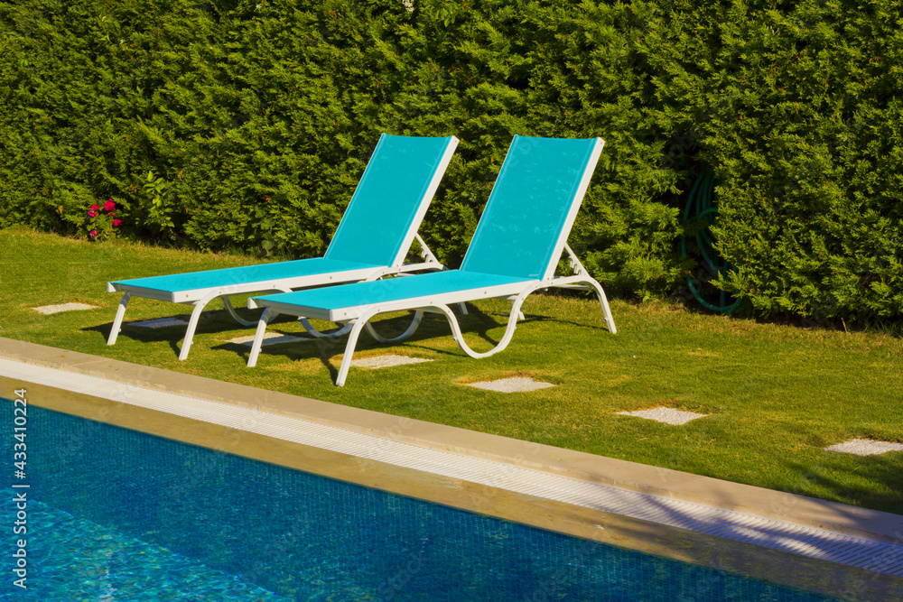 blue swimming pool in a resort with lounge chair