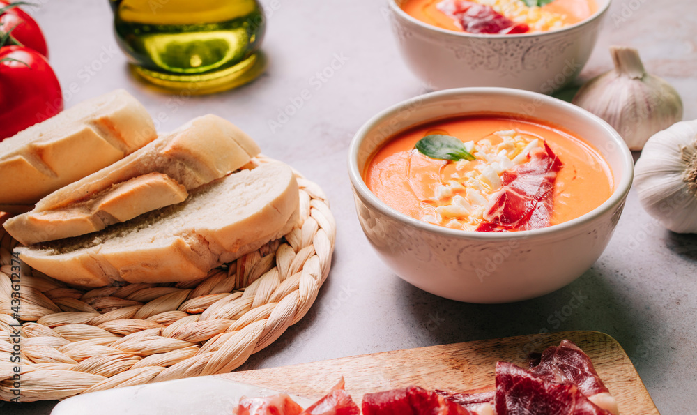 Salmorejo soup in the bowls with jam, olive oil and boiled egg on marble table. Gazpacho tomato soup. High angle view