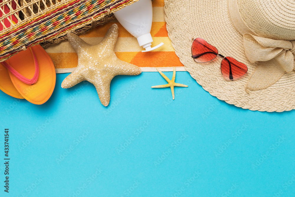 Beach accessories and decorative starfish on a blue background with copy space, summer background