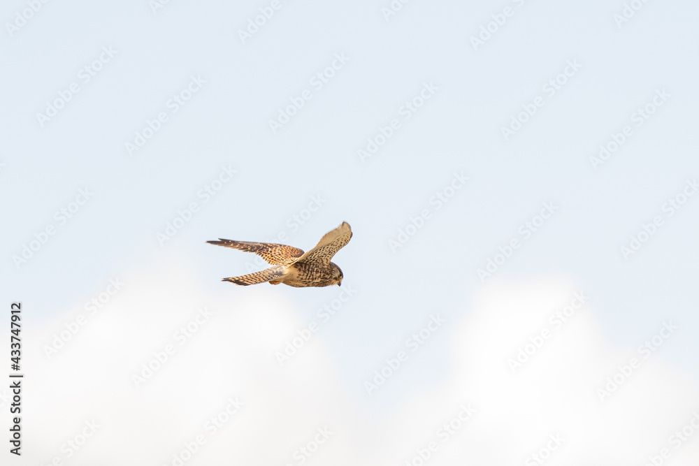 Close-up of Kestrel bird of prey hovers against a beautiful blue sky with white clouds an, hunting for prey
