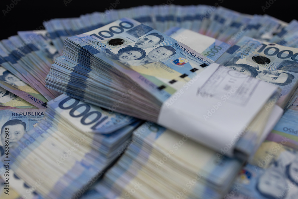 A pile of one thousand Philippines peso banknotes. Cash of Thousand dollar bills, Peso background image.
