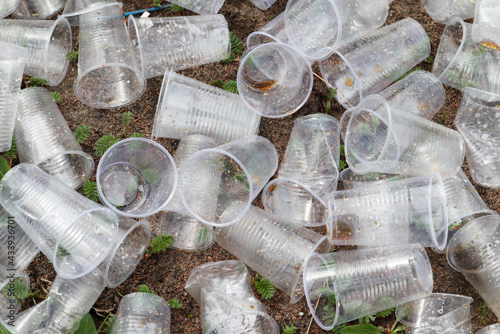 empty used plastic cups on the ground close up - environment pollution after marathon