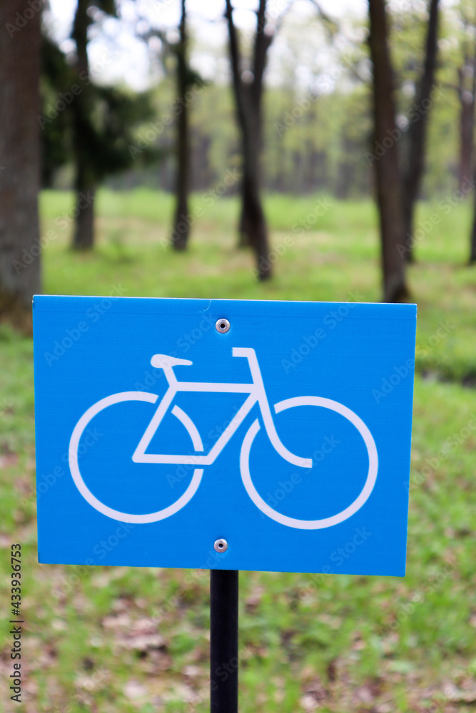 bicycle parking blue sign in the park close up