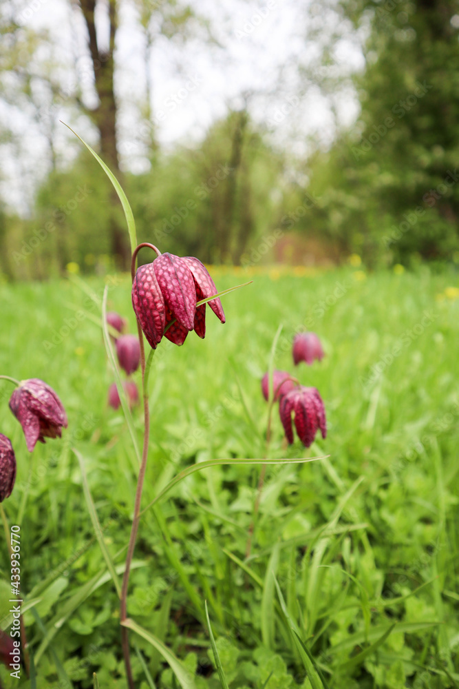 beautfiul Fritillaria meleagris flower in the forest closeup