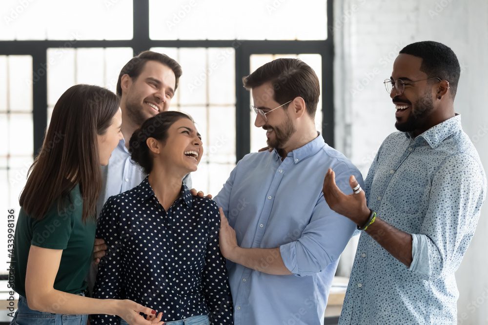 Happy coworkers congratulating excited Indian female employee with hiring or job promotion, welcoming intern to team hugging and cheering. Staff expressing respect and recognition to promoted coworker