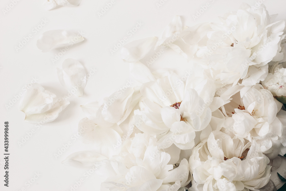 Decorative floral corner, banner made of peonies flowers, petals isolated on white table background. Empty copy space. Flat lay, top view. Picture for blog. Summer wedding or birthday concept.