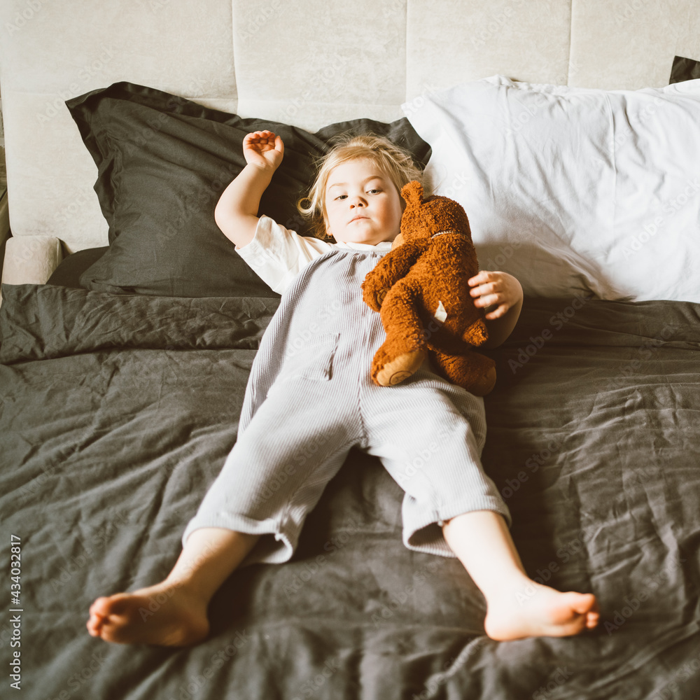 Full length of carefree little girl with blonde hair in grey romper playing with toy soft teddy bear while relaxing on big bed at home and enjoying leisure time. Happy childhood concept