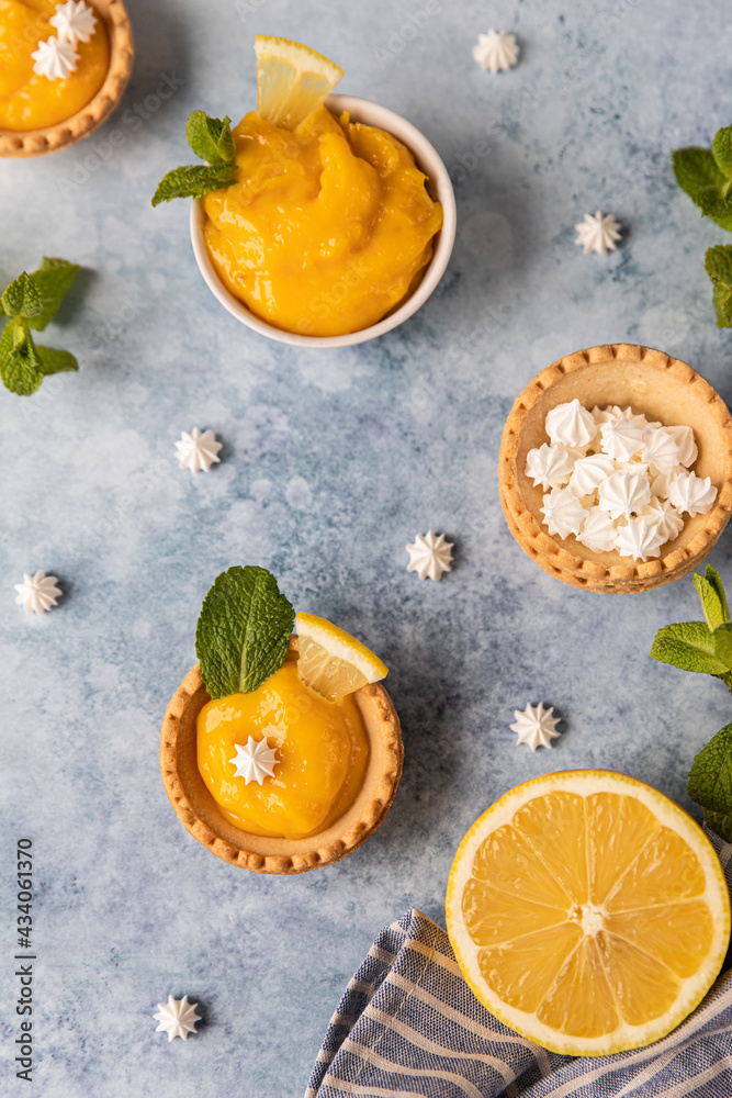 Mini tarts with lemon curd, mini meringue, lemon slices and mint on blue concrete background. Top view.