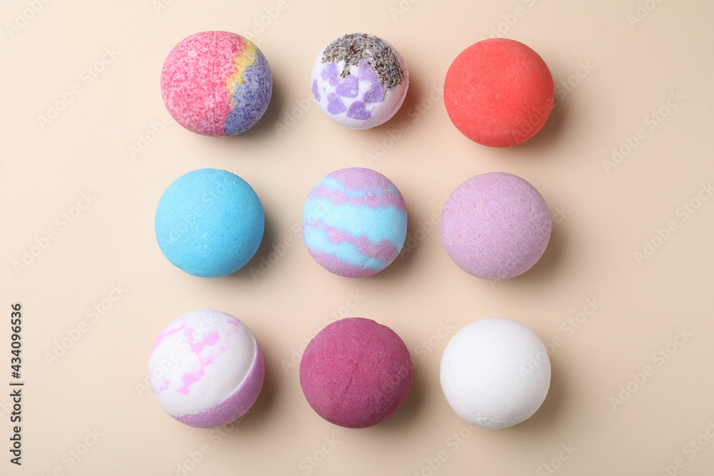 Colorful bath bombs on light background, flat lay