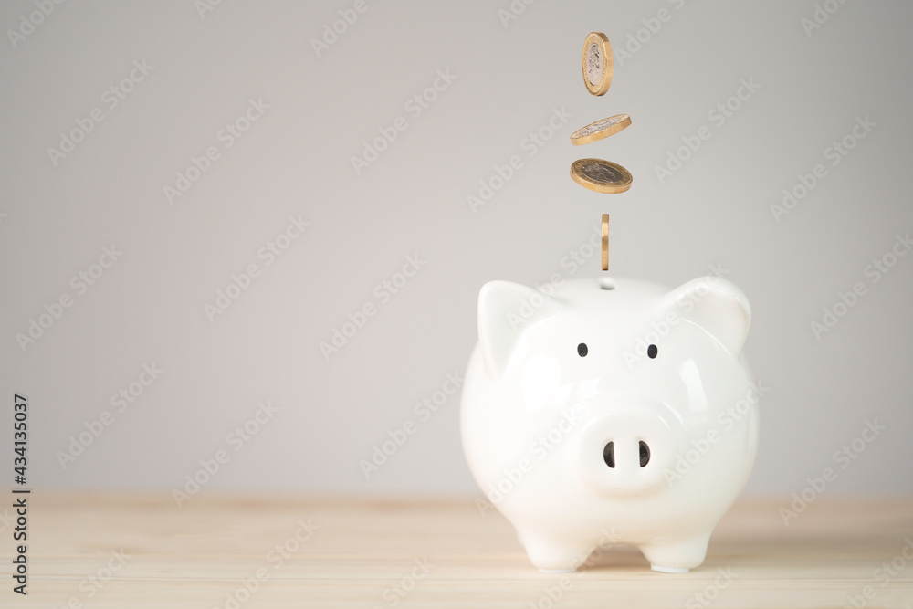 Coins falling and dropping to white piggy bank saving ,money saving for investment and retirement in the future concept.