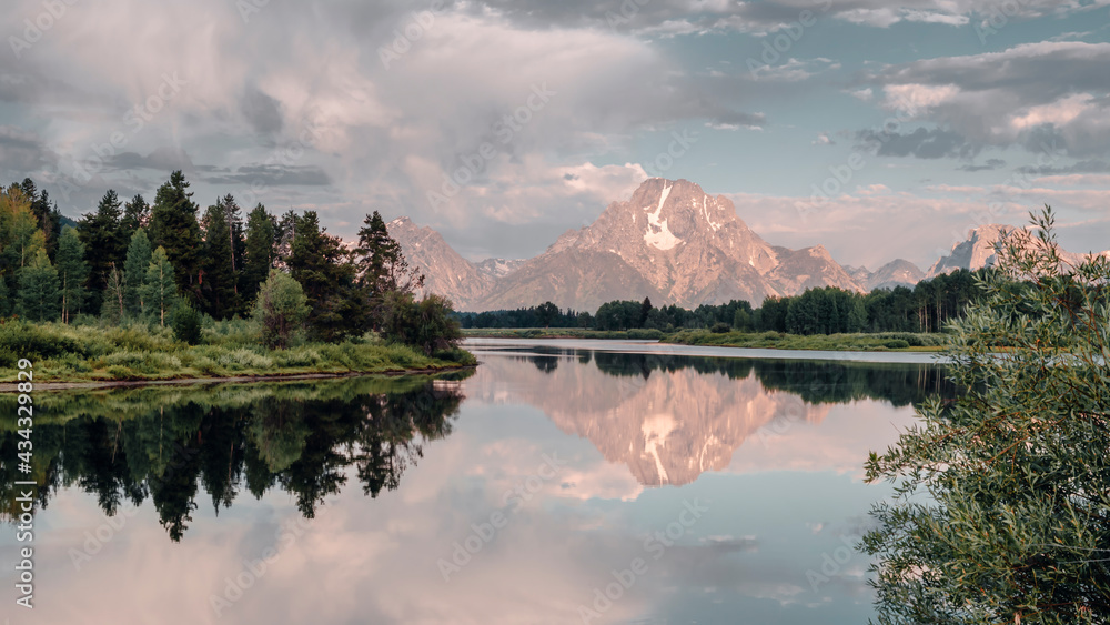 The morning sunrise illuminates Mt. Moran and the Teton Mountain Range a pink hue as they reflect on the Snake River at Oxbow Bend in Grand Teton National Park, WY, USA.