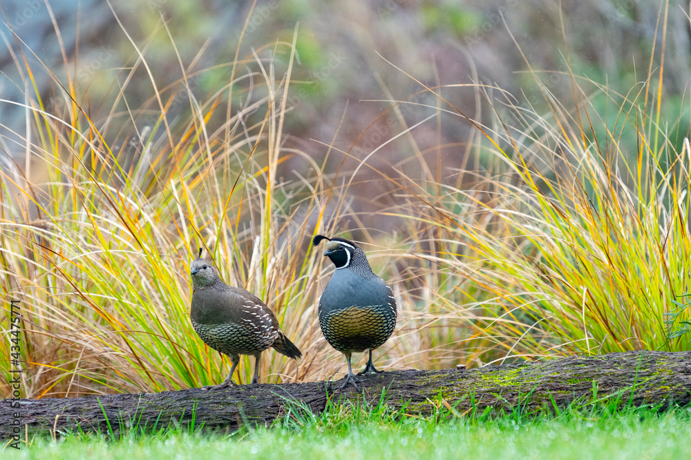 California quail couple standing on log
