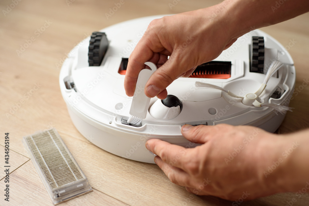 a man cleans the sensor on a robot vacuum cleaner with a special brush