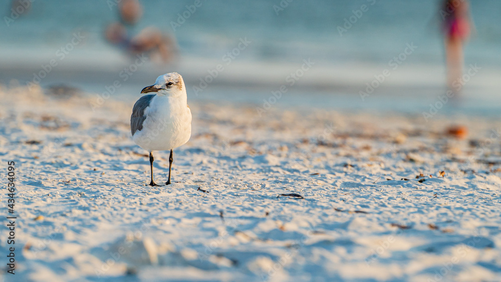 Laughing Gull on beach in full shot at sunset against out of focused background
