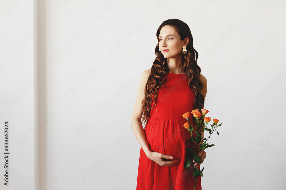 Young beautiful pregnant woman, dressed in a red dress, standing at home near white wall with bouquet of rose flowers in her hands.
