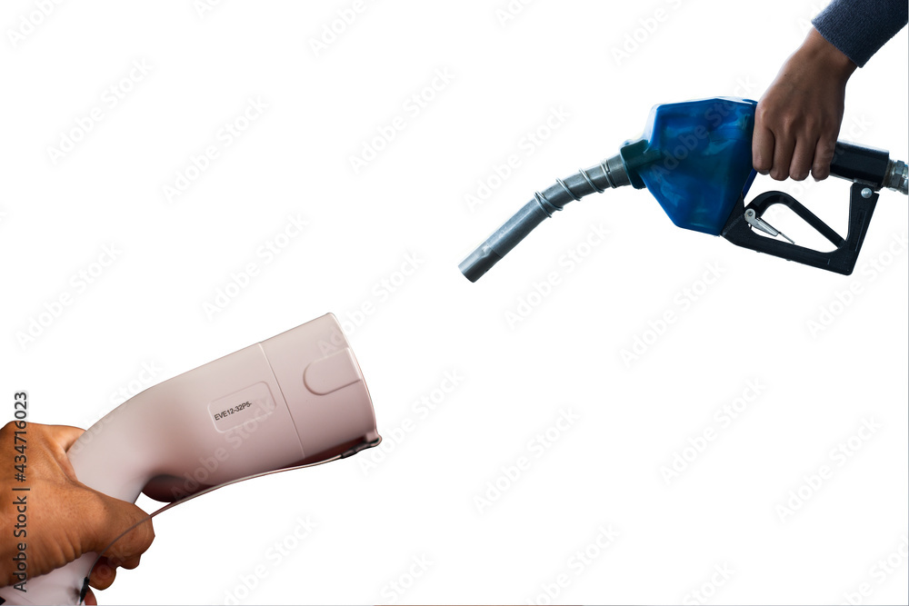 Fuel nozzle and Charging head electric for car On a white background, New alternative energy concept and pure energy
