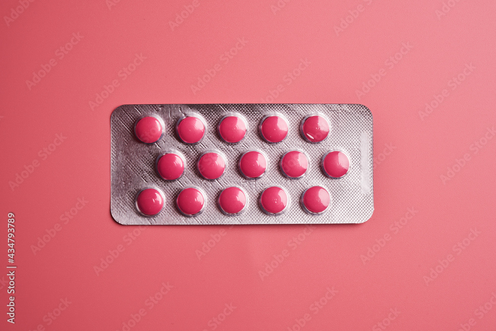 Blister pink pills close up isolated on pink background with copy space. Digestive medicine