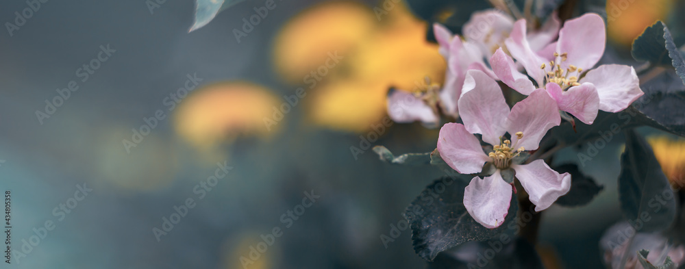 Open pink flowers and buds apple tree. Spring blooming branches in garden. Nature background in early spring.