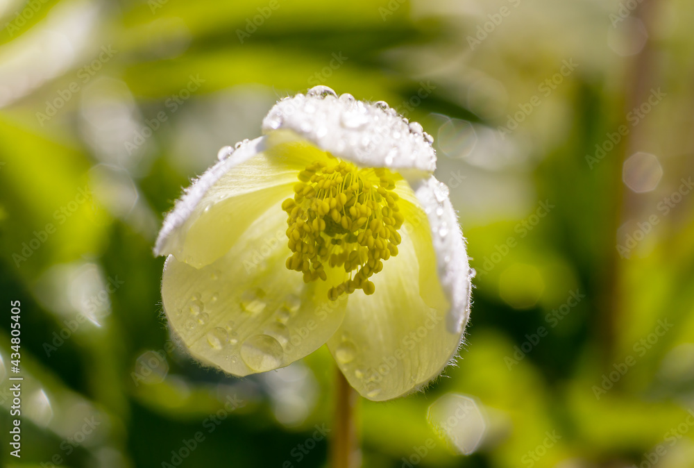 White flowers Anemone forest with raindrops on petals in springtime. Perennial herbaceous plant Rununculaceae family. Selective focus.