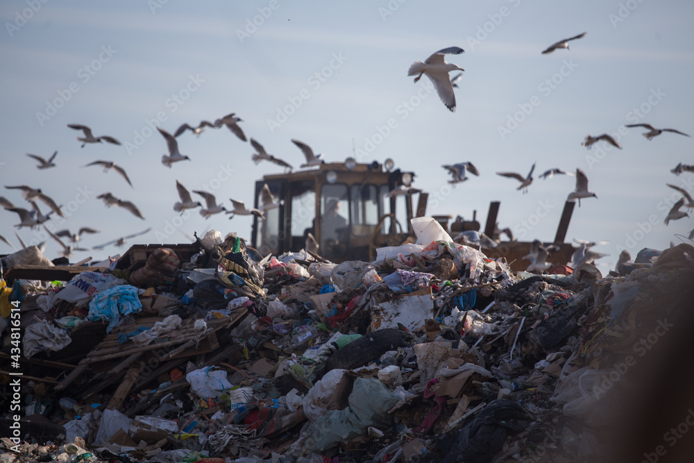 a landfill pollutes the environment. the dirt of industrial enterprise waste is lying in the field. trucks and bulldozers tamp down household waste at the landfill