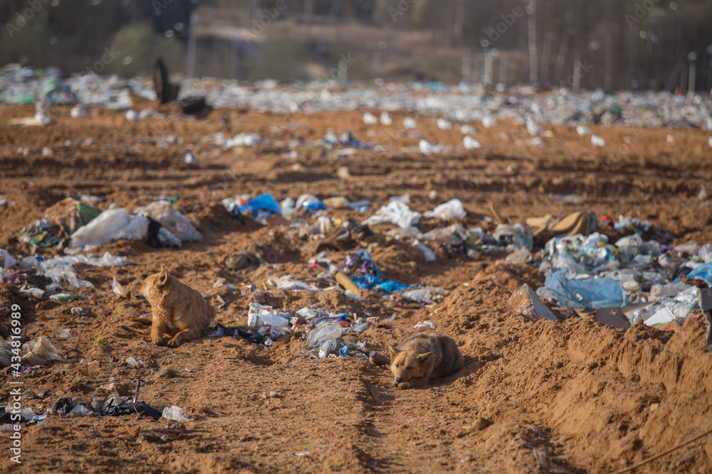 flocks of birds at the landfill. the landfill of dirty household waste pollutes the environment. the environmental problem of garbage dumps