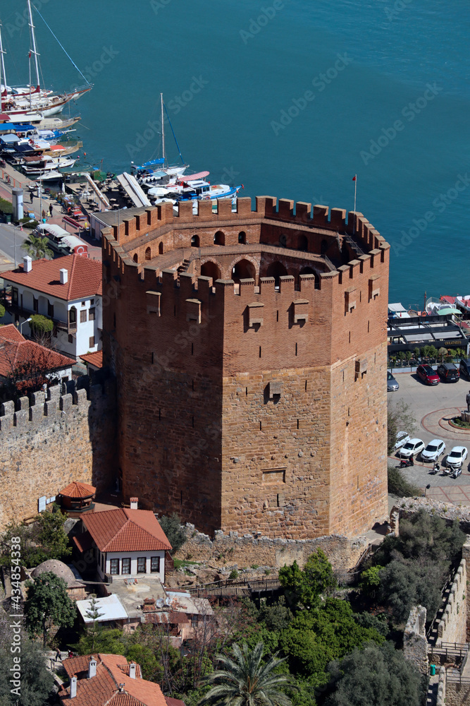 famous ancient landmark Red towr (Kizil Kule) in Turkey with view of the Alanya city on the background