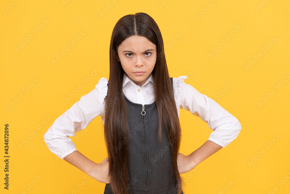 Becoming disobedient. Disobedient child yellow background. Frown girl stand with arms akimbo