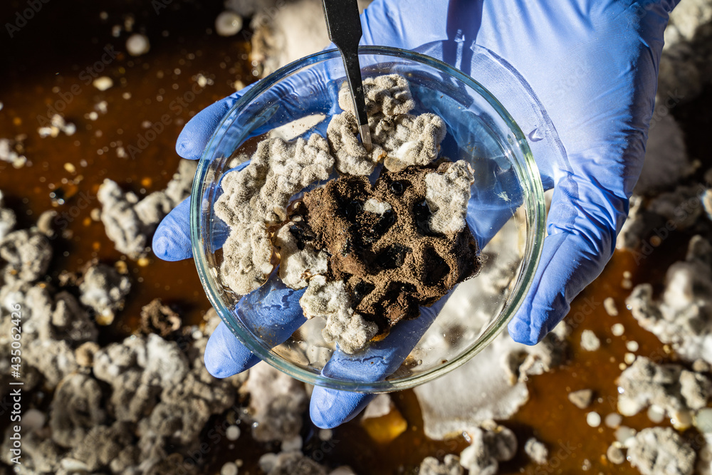 molds and fungal testing from clinical samples, hold in scientist hand in medical health laboratory.